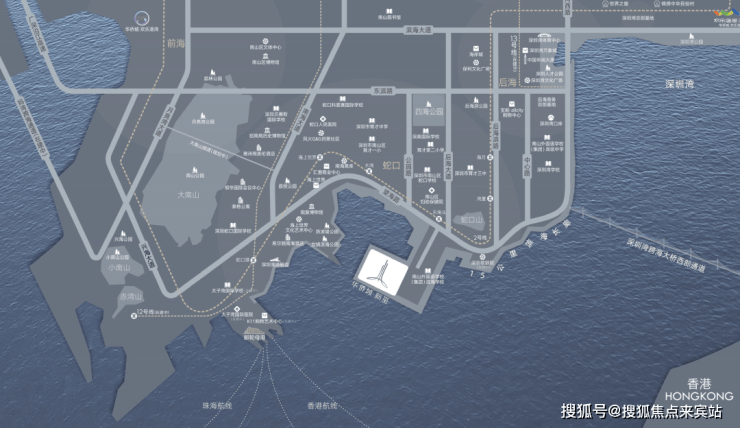 华侨城新玺地处前海蛇口自贸区,毗邻香港,拥有得天独厚的地理位置。项目周边交通网络发达,通过望海路、南海大道、后海大道等城市干道及地铁2号线东角头站,与周边区域建立便捷的外部交通联系。此外,项目还临近太子湾邮轮母港,可快速辐射深圳国际机场、香港国际机场等城市核心交通要塞。